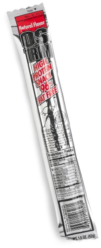 Ostrim High Protein Snack, Beef & Ostrich, Natural Flavor, 1.5-Ounce Sticks (Pack of 20). Are high-protein, low-calorie Ostrim meat sticks. They taste great-teriyaki, BBQ, or pepper flavors--and pack just 20 calories, zero grams of fat, and a hefty three grams of protein per meaty rod.